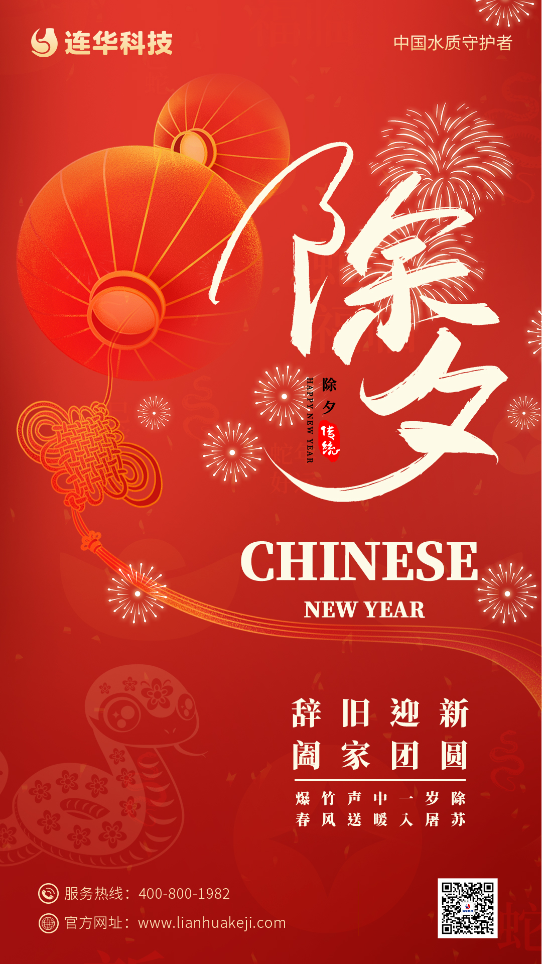 舊歲的余暉 漸漸隱沒(méi)于時(shí)光的幕后 新的一年 攜著新生的憧憬與希冀翩然而至 除夕佳節(jié) 連華科技全體員工恭祝大家 蛇來(lái)運(yùn)轉(zhuǎn)巳巳好 心想事成步步高 家庭幸福美滿(mǎn) 生活平安喜樂(lè)