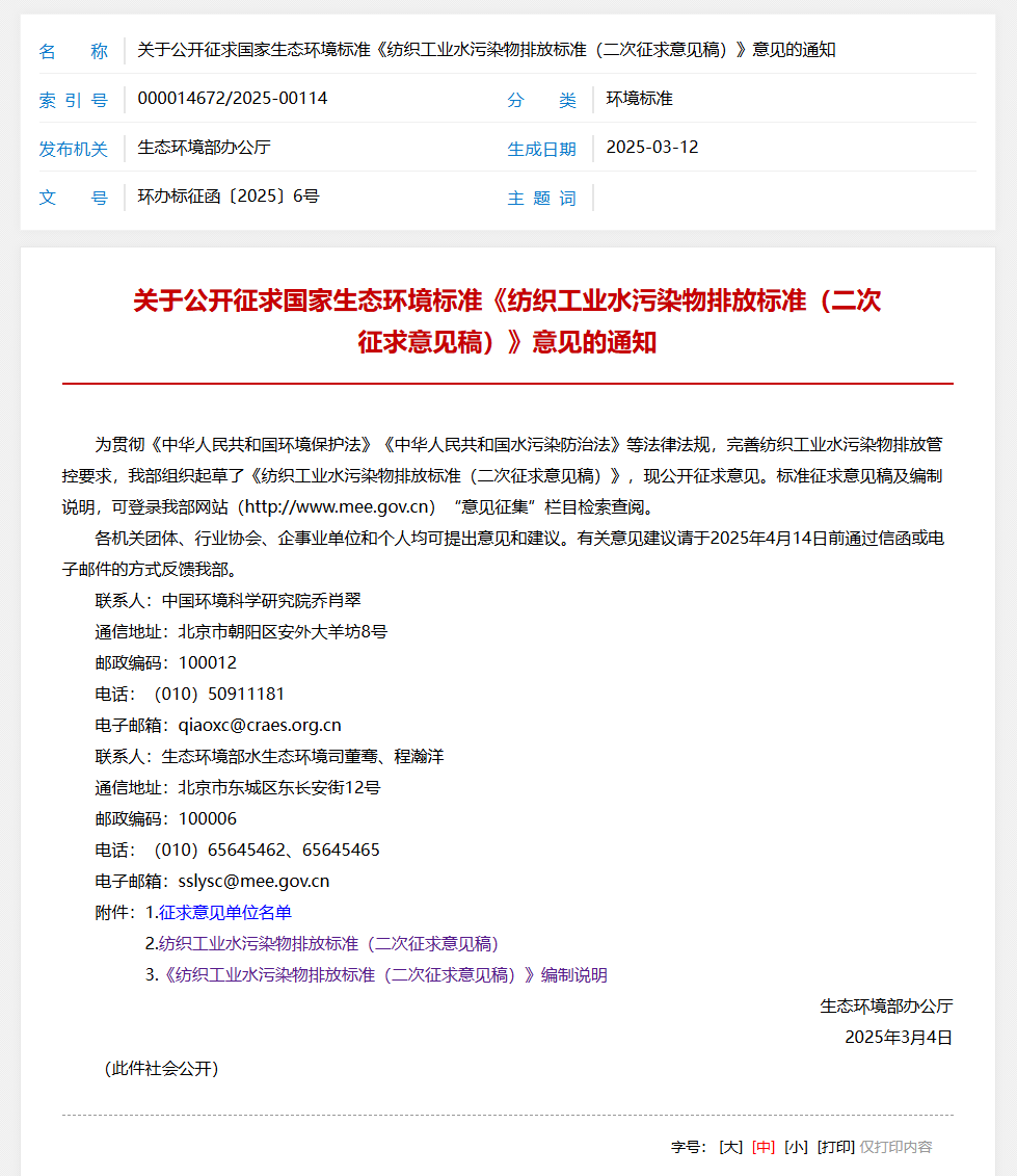 日前,為為貫徹《中華人民共和國環(huán)境保護法》《中華人民共和國水污染防治法》等法律法規(guī),完善紡織工業(yè)水污染物排放管控要求,生態(tài)環(huán)境部起草了《紡織工業(yè)水污染物排放標準(二次征求意見稿)》,現(xiàn)公開征求意見。