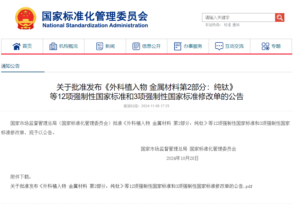 關(guān)于批準(zhǔn)發(fā)布《外科植入物 金屬材料第2部分:純鈦》等12項(xiàng)強(qiáng)制性國家標(biāo)準(zhǔn)和3項(xiàng)強(qiáng)制性國家標(biāo)準(zhǔn)修改單的公告