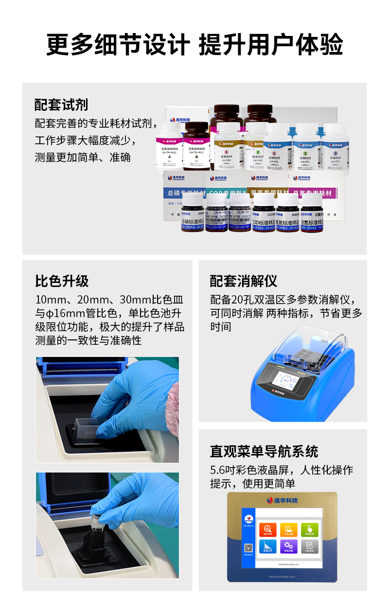 簡要描述: 儀器符合《HJ924-2017COD光度法快速測定儀技術要求及檢測方法》,所有檢測項目依據國家行業(yè)標準:COD-《HJ/T399-2007》、氨氮-《HJ535-2009》、總磷-《GB11893-89》。可測定化學需氧量(COD)、氨氮、總磷、總氮、懸浮物、色度(鉑鈷色系)、濁度、重金屬、有機污染物和無機污染物等多項指標,濃度直讀。