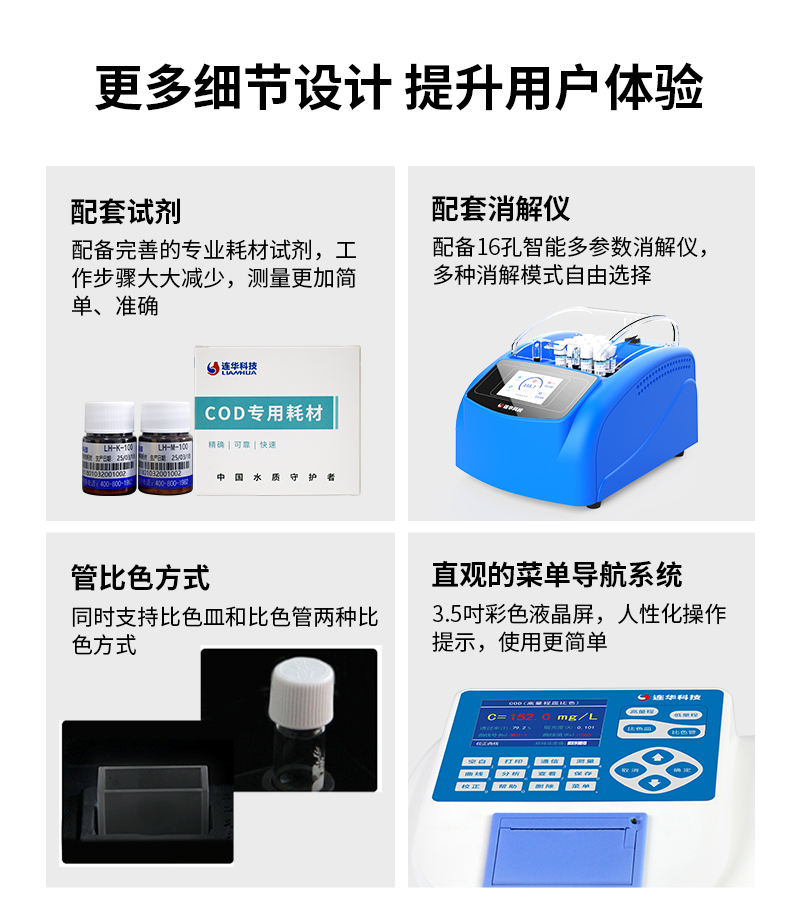 2、測(cè)定COD高量程、COD低量程水樣,還同時(shí)支持皿比色和管比色兩種比色方式;