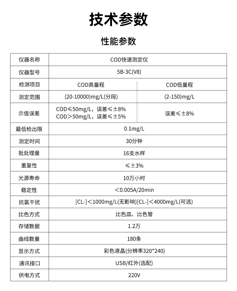 1、測(cè)定范圍:(20~10000)mg/L(分段)
