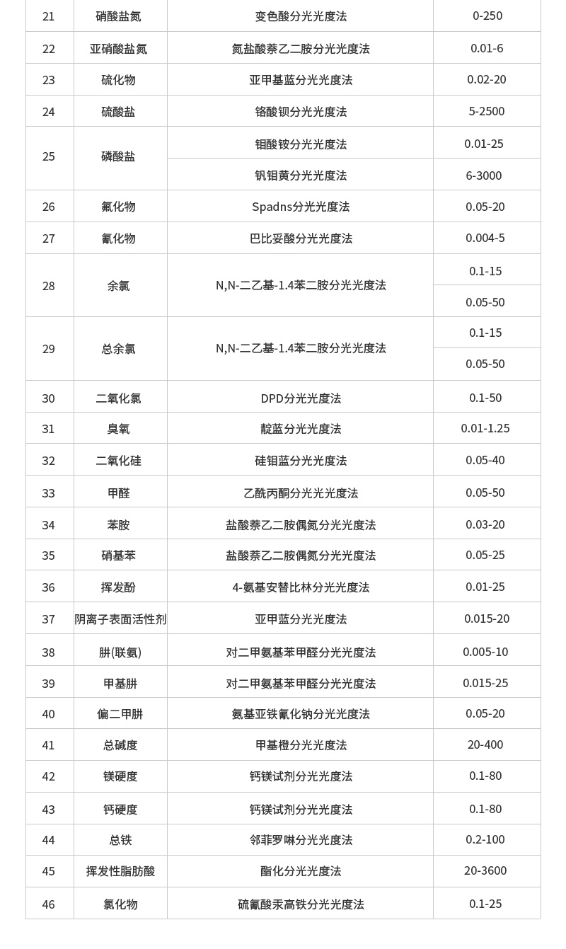 1、46項(xiàng)指標(biāo):直接測定化學(xué)需氧量(COD)、氨氮、總磷、總氮、懸浮物、色度、濁度、重金屬、有機(jī)污染物和無機(jī)污染物等多項(xiàng)指標(biāo),濃度直讀;