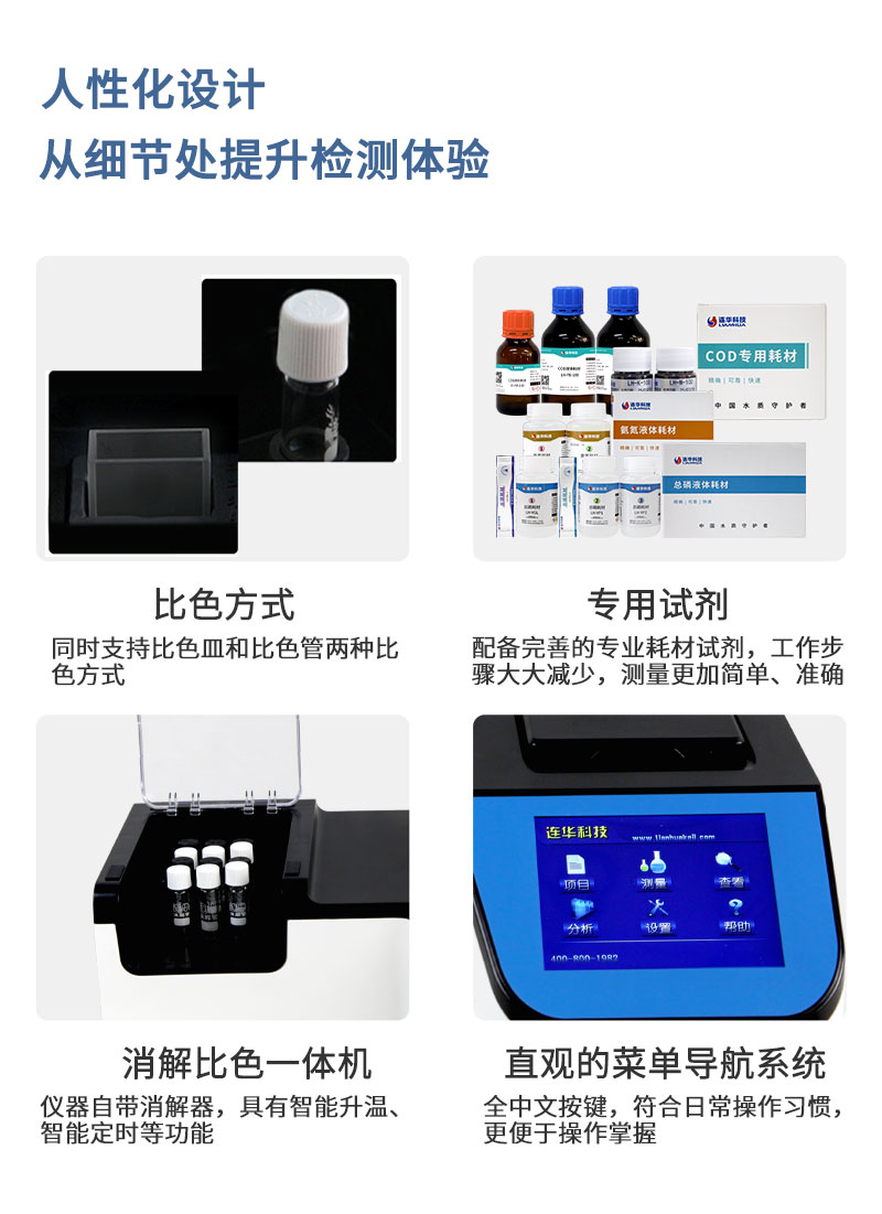 6、儀器自帶消解器,具有智能升溫、智能定時(shí)和延時(shí)保護(hù)等功能,可對水樣進(jìn)行消解;