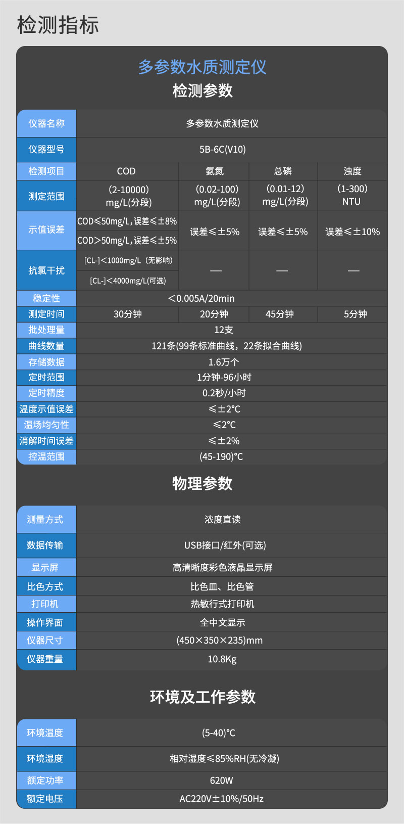 5B-6C(V10)多參數(shù)水質(zhì)測定儀在穩(wěn)定性、準(zhǔn)確性、測定范圍、多功能、實(shí)用簡便性等多方面實(shí)現(xiàn)了質(zhì)的提升,具有很高的性價(jià)比,可測定COD、氨氮、總磷、濁度四個(gè)指標(biāo)。